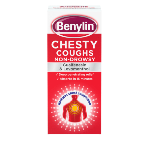 Benylin Chesty Coughs Original contains an expectorant to loosen mucus and make it easier to expel. Levomenthol eases congestion and makes it easier to breathe.