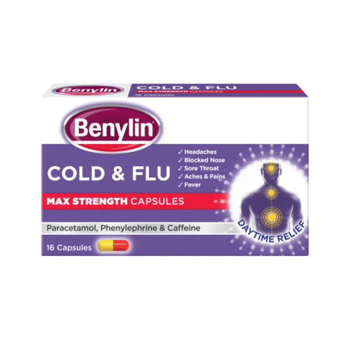 Benylin Cold & Flu Max Strength Capsules are designed to relieve symptoms of colds and flu, including headache, fever, nasal congestion, sore throat, fatigue, and body aches. These capsules contain paracetamol to reduce pain and fever, caffeine to combat tiredness and enhance pain relief, and phenylephrine to relieve nasal congestion.