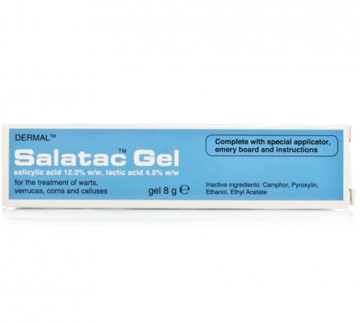 Salatac Gel is a topical treatment used to remove warts, verrucas, corns, and calluses. It contains salicylic acid and lactic acid, which work together to break down thickened skin and help the affected area gradually peel away.